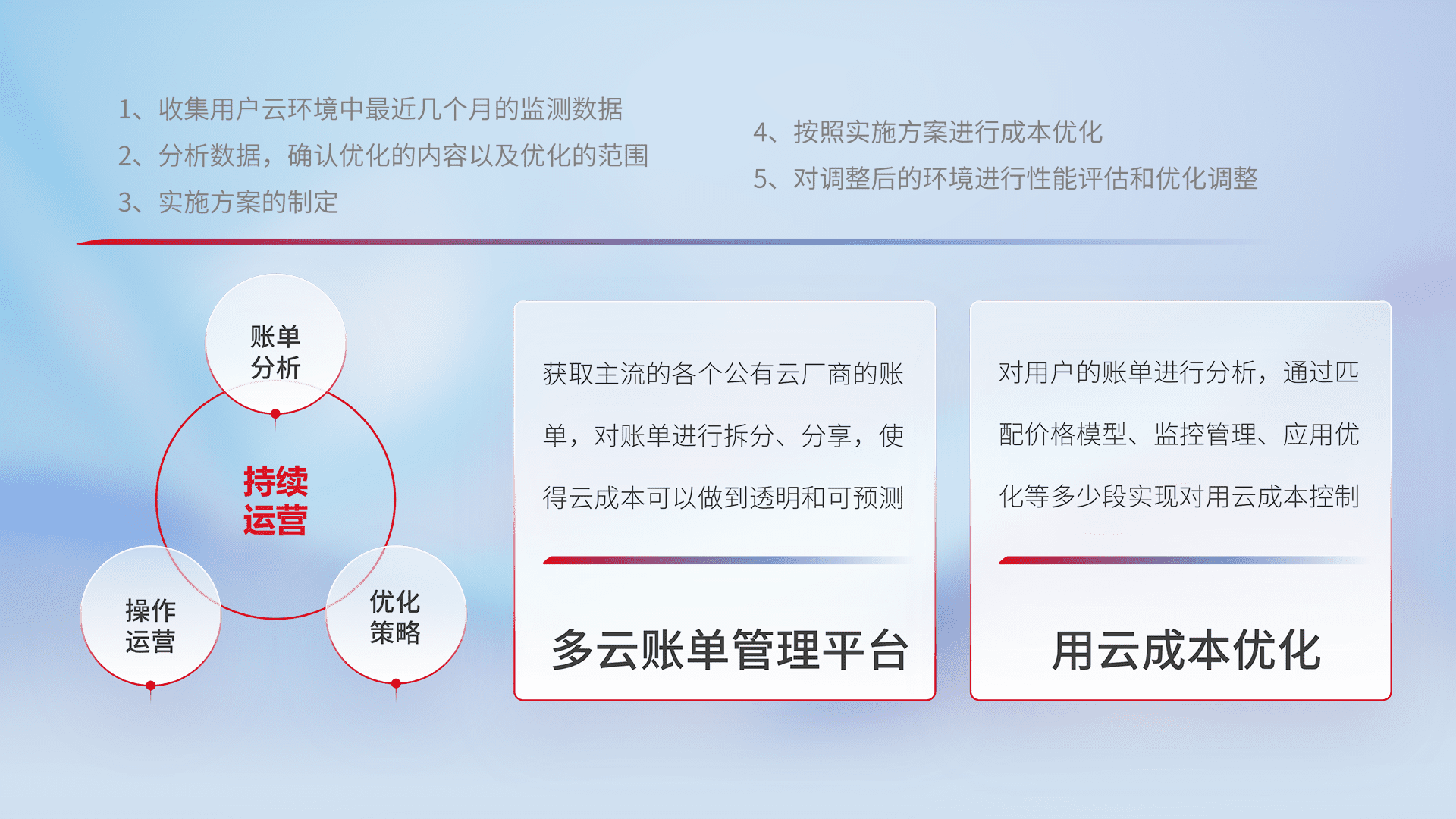 通过多云纳管,,,,以统一的资源数据模型把客户的云资源进行抽象和封装,,,,进而实现对多云资源的统一操作,,保障云资源管理的可靠性、、、、稳定性与可用性。。。。量身定制化运维内容,,,,配置、、、开发运维、、、、补丁管理、、备份、、、、监控、、认证和访问管理、、、、审计和日常巡检等,,保障在用云过程中的可靠度,,稳定度以及高可用率。。