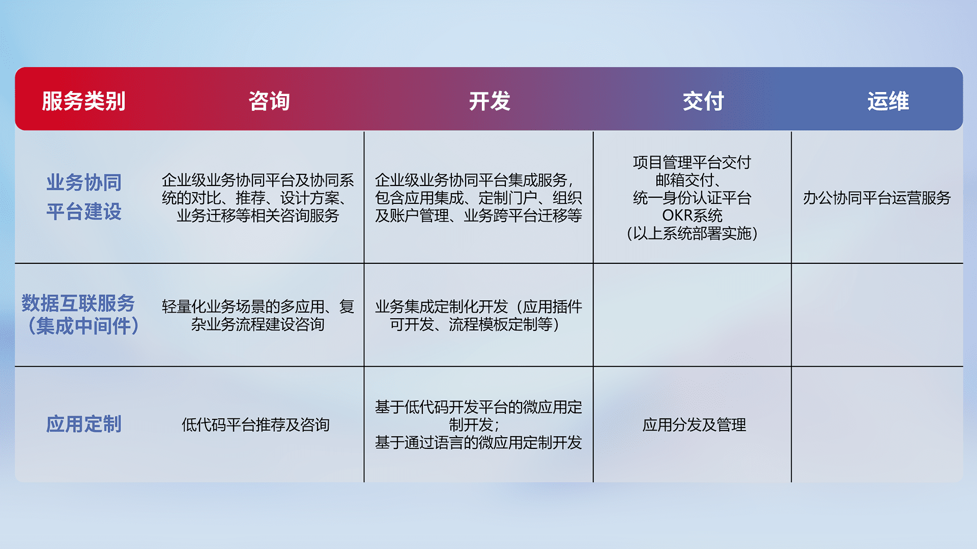针对钉钉、、、企微、、、、IDaas等平台级产品提供产品的规划、、方案、、、、交付、、、、定制化开发等服务,,,,实现如统一协同办公、、、智能客户服务、、混合会议管理、、智能数据查询、、、、等业务场景,,,实现数字化转型。。。。